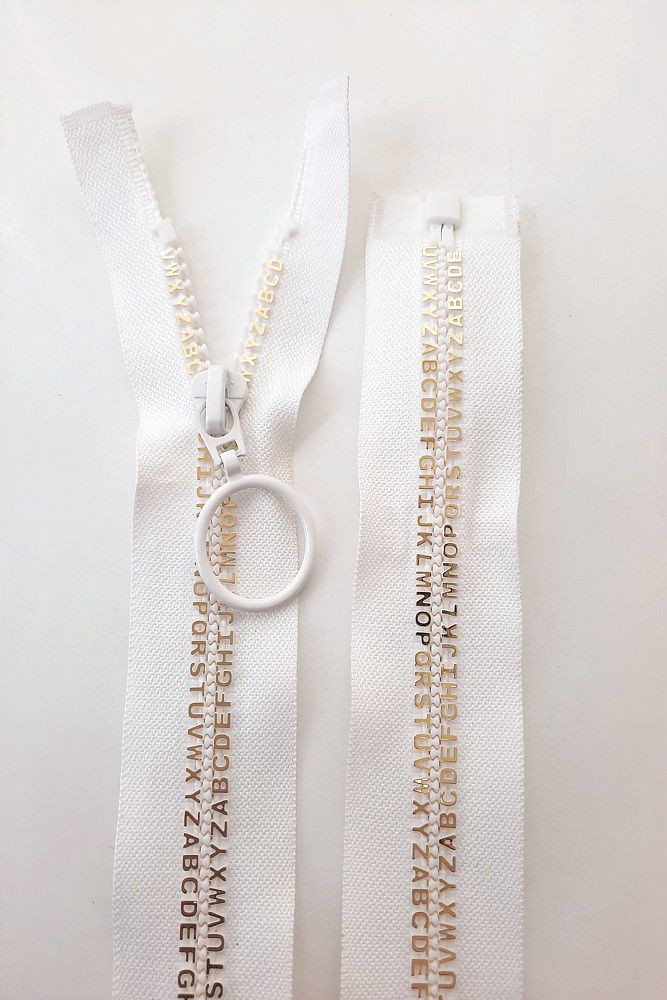 Dlouhý zip dělitelný - písmenka 65 cm, zuby 8 mm, bílá/zlatá