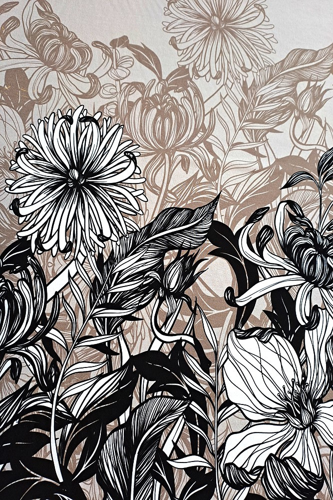 Viskóza tisk - černobílé květy na béžové, raport 75 cm, panel