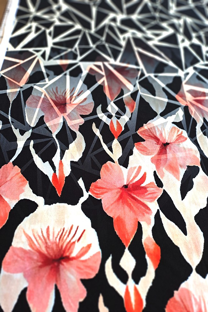 Viskóza tisk - geometrické tvary s květy, raport 120 cm, panel