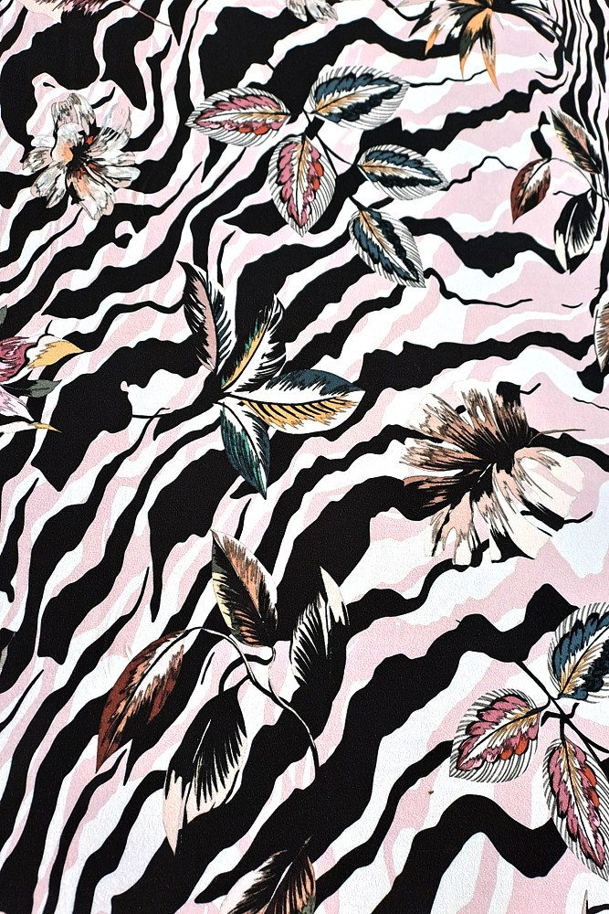 Viskóza tisk - černá/bílá/pudrová linie s listy, prémiová kvalita