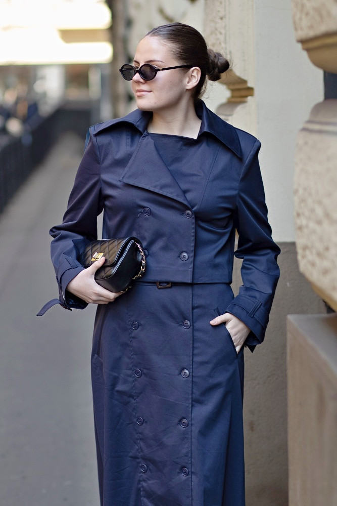 Er vereint die zeitlose Eleganz des klassischen Trenchcoats mit einer modernen, kürzeren Länge, die frisch und zugleich zeitgemäß wirkt.