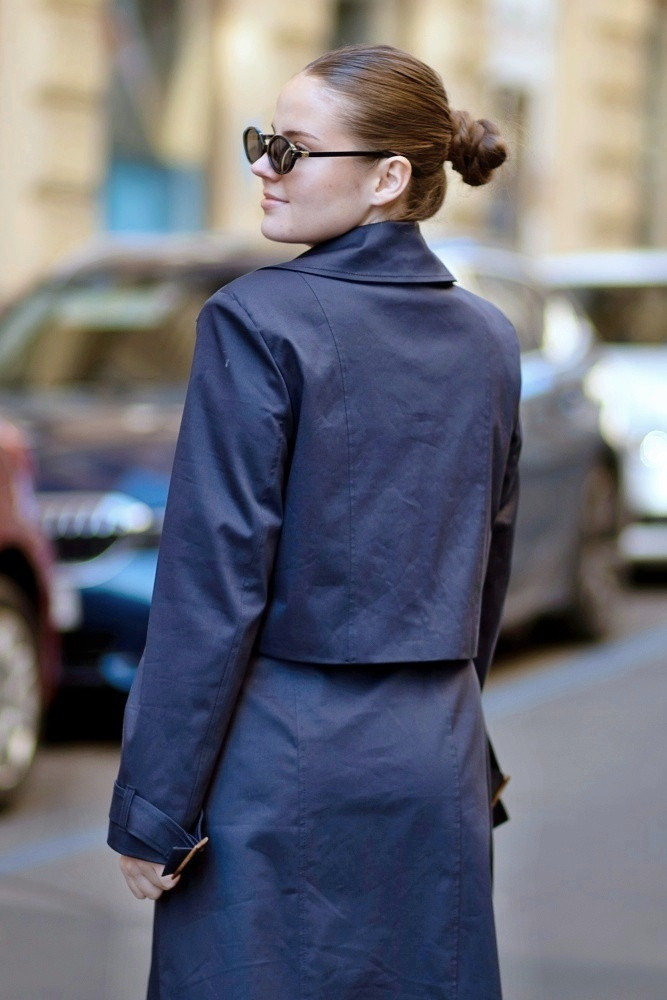 Die doppelreihige Knopfleiste verleiht dem Modell einen raffinierten Look, während der kürzere Schnitt vielseitige Kombinationsmöglichkeiten mit Hosen, Röcken oder Kleidern bietet.